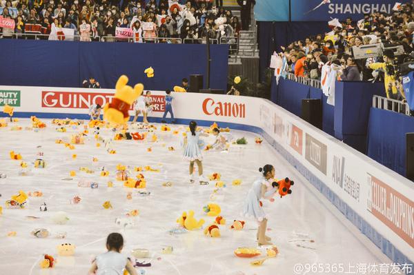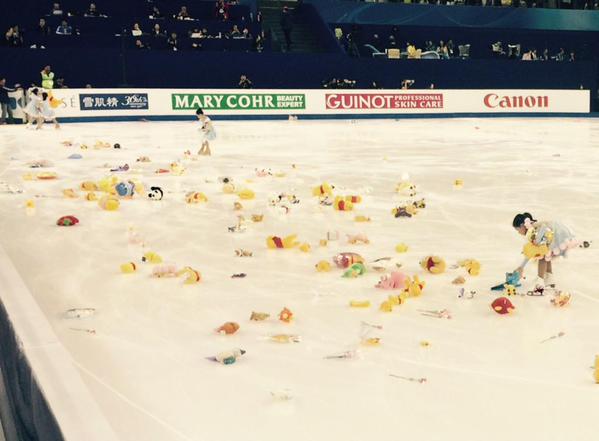 花束などが投げ込まれる場面はよく見られるが、大量のプーさんが投げ込まれスケートリンク上はカオス状態。スタッフの女性がそれを集め回収している場面が映されているが大変そうである。