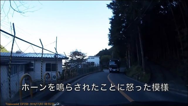トラックの運転手は「何しとんじゃ、コラ」と叫んで、撮影者の車を叩いた。「ふざけんなよ、コラ」、「死ね、アホ」と 罵声が続く。パトカーが現場に駆けつける場面で、動画は終わる。