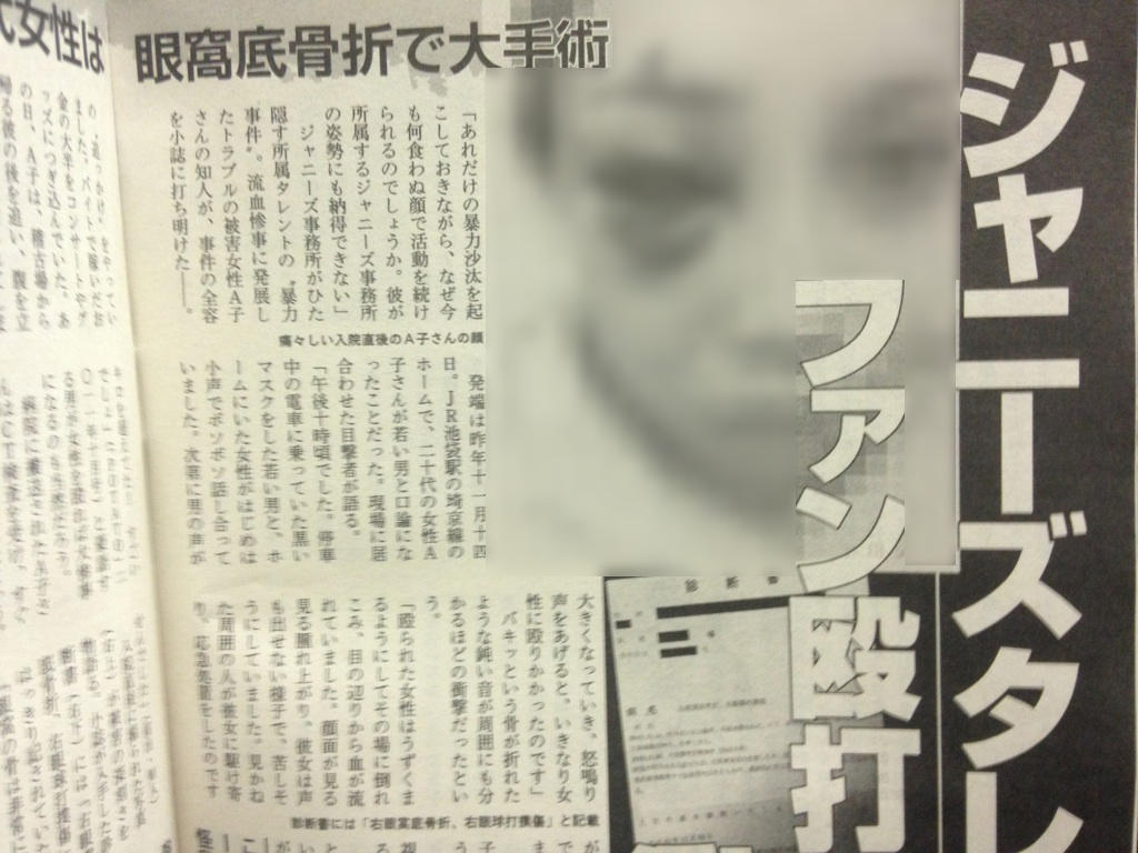 A子さんは病院に搬送されたが、右眼窩底と内壁を骨折する重傷。事件について、ジャニーズ事務所は大筋で認めたが、謝罪や反省の言葉はなかった。