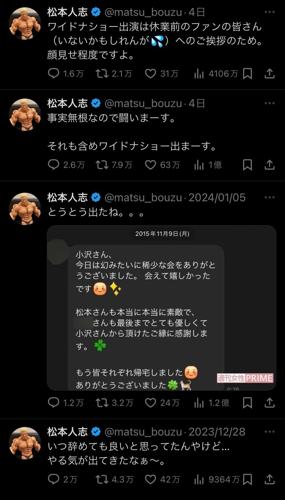昨年12月27日発売の「週刊文春 」 で報じたダウンタウンの松本人志(60)の「恐怖の一夜」。スピードワゴンの小沢一敬に女性を集めさせ、グランドハイアット東京のスイートルームで飲み会を開催していたことなどを詳報した。参加者のA子さんと2人きりになった松本が「俺の子ども産めや!」などと性行為を迫った様子や、同時期に松本から肉体関係を迫られ、心的外傷を負ったと語るB子さんの証言も掲載している。