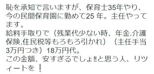 老害に3万も支給するならこういう保育士や介護士に従事してる人達に回せと思うわ、これじゃ少子化を推進してるのと変わらん