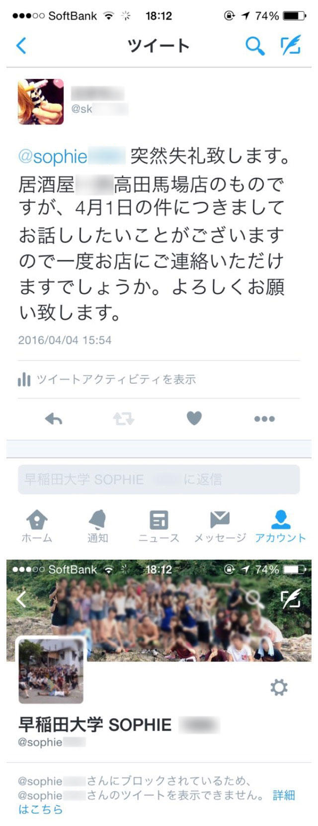 告発ツイートは2016年4月4日に連続して投稿された(6日14時までにいずれも削除)。