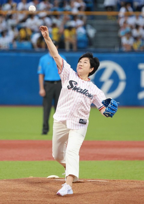 小池氏は6日夜、明治神宮野球場(新宿区)で行われたプロ野球、ヤクルト-阪神戦前の始球式に登場した。
