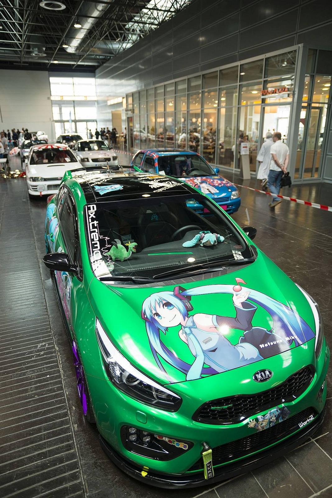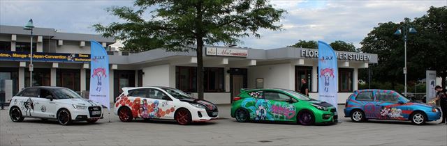 アニメファン向けイベントの会場前にずらりと並ぶドイツの「痛車」。ここはドイツです