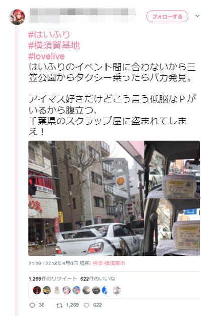 昨夏には、「痛車」とその持ち主の男性らを盗撮した画像を公開し、「アニヲタがたまってるこわー笑」と嘲笑した。