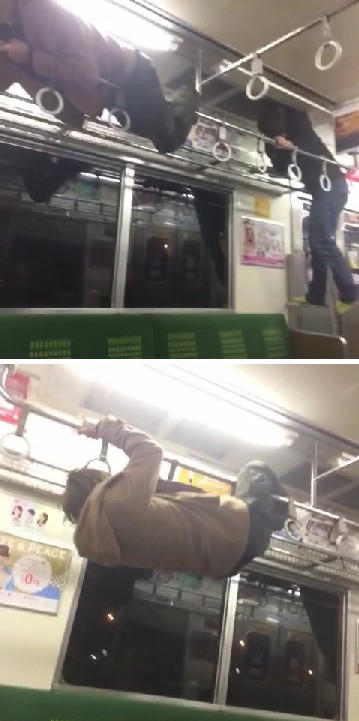網棚の上によじ登って寝そべったり、吊革が下がっている金属棒の上を移動したり、金属棒に手や足を引っかけて回転したりと、やりたい放題である。